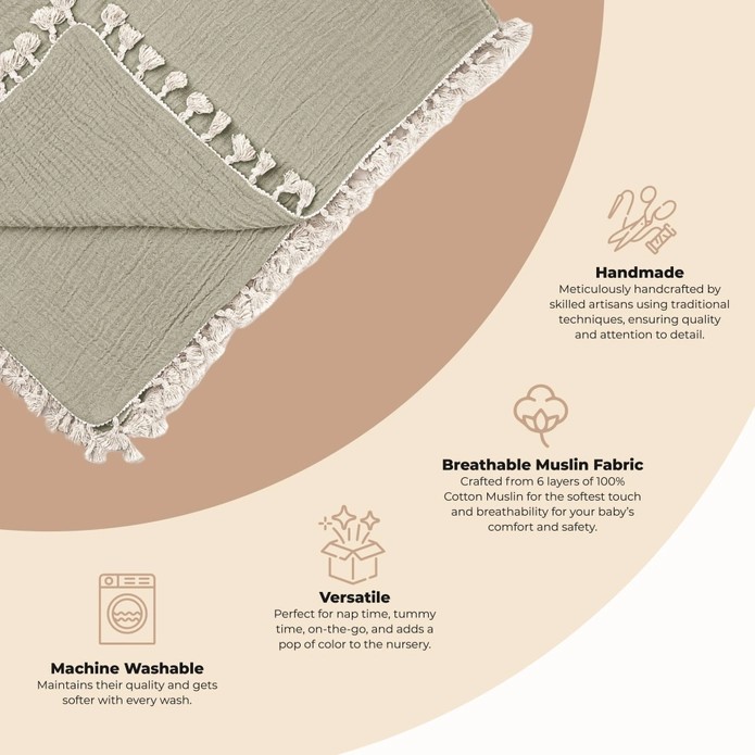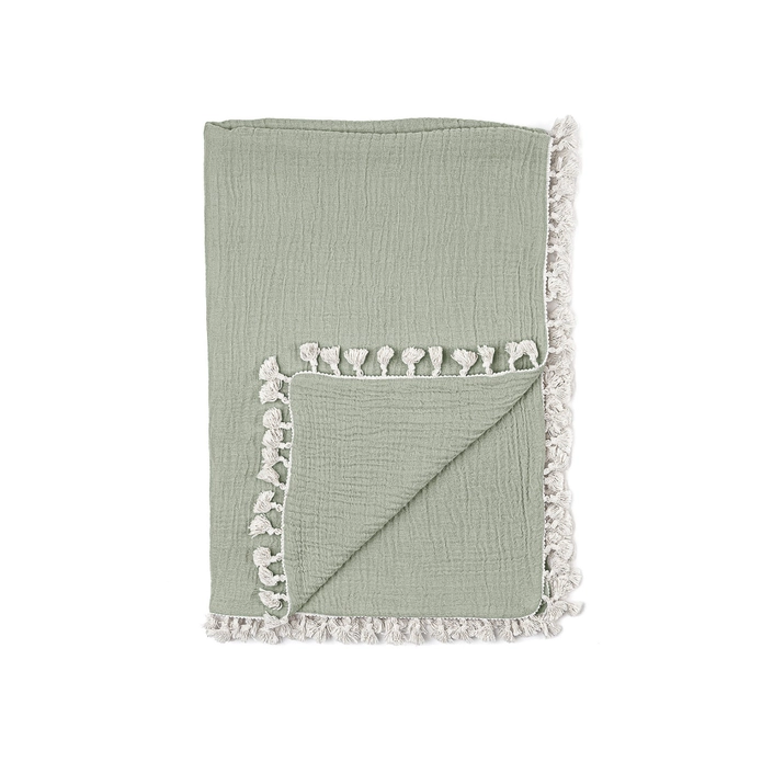 This blanket is a delightful blend of style and comfort, with a delicate fringe trim that adds a touch of botanical charm. Its lightweight design makes it perfect for leisurely strolls or playful moments in the nursery. With its easy-care machine washability, you can enjoy its beauty without any hassle. The captivating fern color effortlessly infuses a sense of nature into any space, and it pairs harmoniously with many of our fabulous baby sets. Wrap your little one in comfort and style, making precious memories in their cozy nursery.